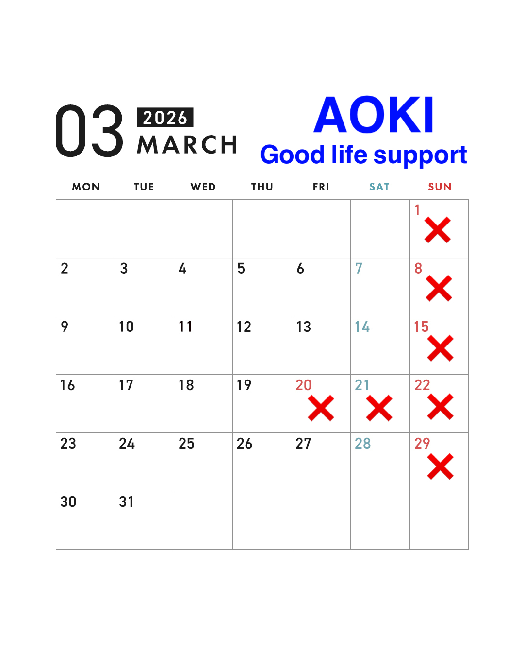 3月の休業日をお知らせします。 何卒宜しくお願い申し上げます。